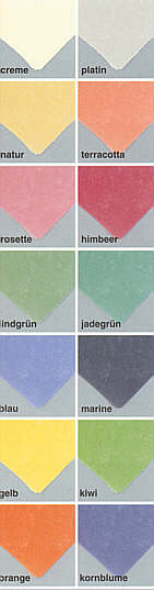 Farben:  creme, natur, rosette, lindgrün, blau, gelb, orange, terracotta, himbeer, jadegrün, marine, kiwi, kornblume
